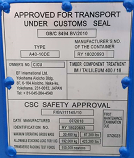 シーエスシー プレート。CSC条約に規定された安全検査に合格したコンテナにはCSCプレートが取り付けられる。CSCプレートはConsolidated Plateとも呼ばれ、CSC条約に基づく安全承認板に加え、TIR&CCC条約に基づく国際輸送承認板、国際植物防疫条約に基づく防虫処理銘板が一つになっている。
