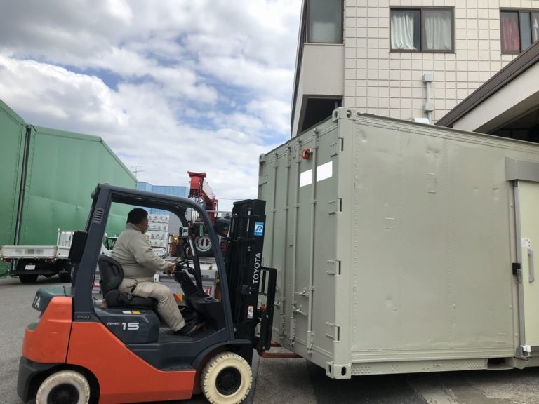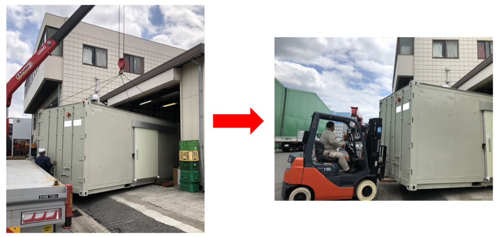 今回、設置場所が屋内のため、屋外でユニック車から吊り上げてコンテナを降ろし、屋内へフォークリフトで押して移動し設置する方法を取りました。