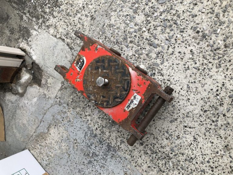 微調整しながら移動させて、コンテナの底のコーナーに板版を挟む。(コンテナを水平に保つ)