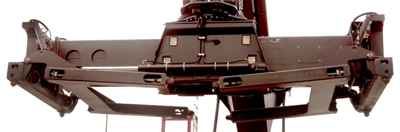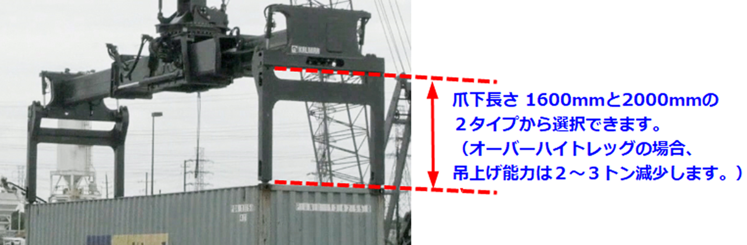 より低い位置にあるコンテナ荷役、積荷がコンテナ高さを超えているオープントップコンテナの荷役などに威力を発揮します。折り畳み可能。折り畳み時は通常コンテナの荷役も可能。