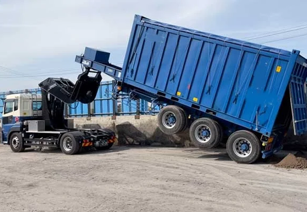 後面のフラップドアを備え排出も容易です。このような特性から、廃材や焼却灰などの運搬に非常に適しています。 ただし、天候の影響を受けやすいという欠点がありますが、防水シートが簡単に展開出来ます。これにより、貨物を雨や風から守り、品質を維持することができます。
