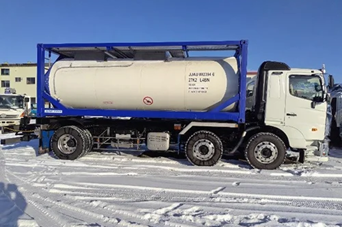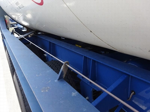 他のISOコンテナと同様、セミトレーラーで運びます。タンクフレームは海上コンテナと同じです。隅金具を緊締装置(ツイストロック)で固定します。
