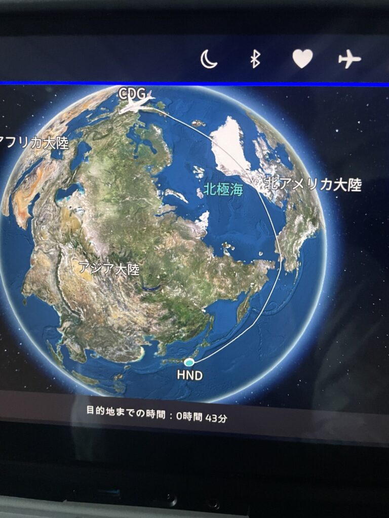 復路は疲れから気にする余裕はなかったのですが、同じくパリでトランジットを行い、その後カザフスタン・モンゴル上空を通っているのを確認出来ました。